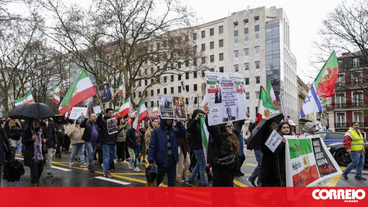 Os manifestantes empunhavam bandeiras do Irão, de Portugal, Israel e Estados Unidos, bem como cartazes com o rosto do príncipe herdeiro Reza Pahlavi, filho do xá deposto em 1979 pela Revolução Iraniana, e do Presidente dos Estados Unidos, Donald Trump.