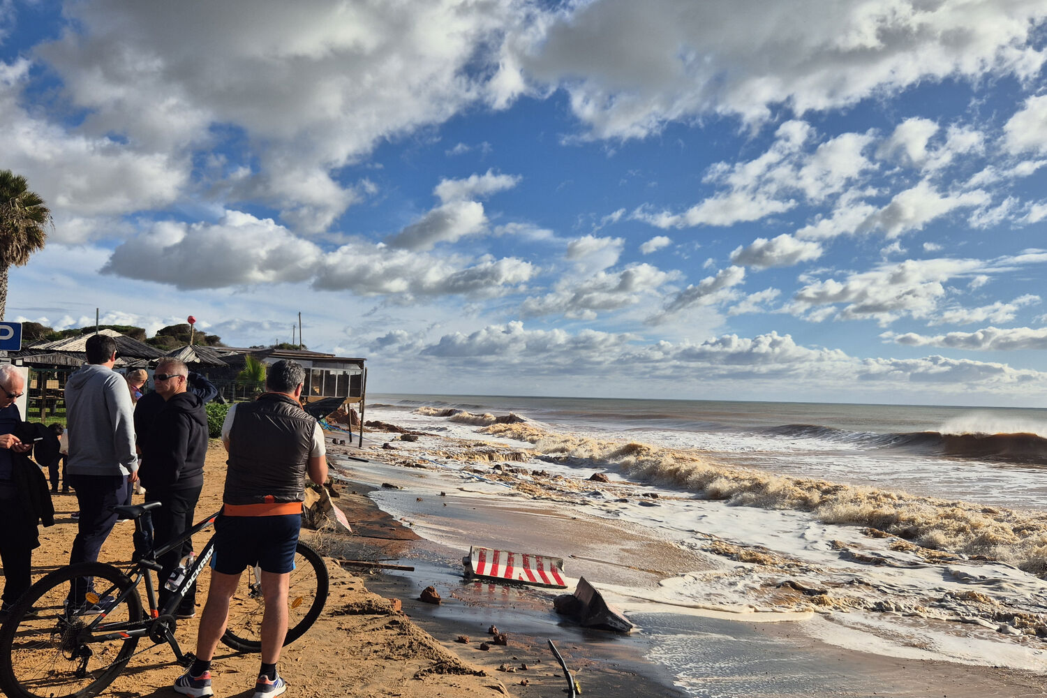 A praia do Forte Novo, em Quarteira, voltou a ser engolida pelo mar. Um restaurante estava este domingo em risco de ser arrastado pela ondulação, estando seguro apenas por duas estacas de madeira.