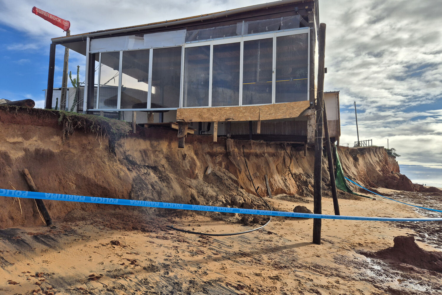 Devido ao avanço da maré, que levou muita da areia que havia junto ao restaurante, a estrutura ficou praticamente à mercê da forte ondulação.