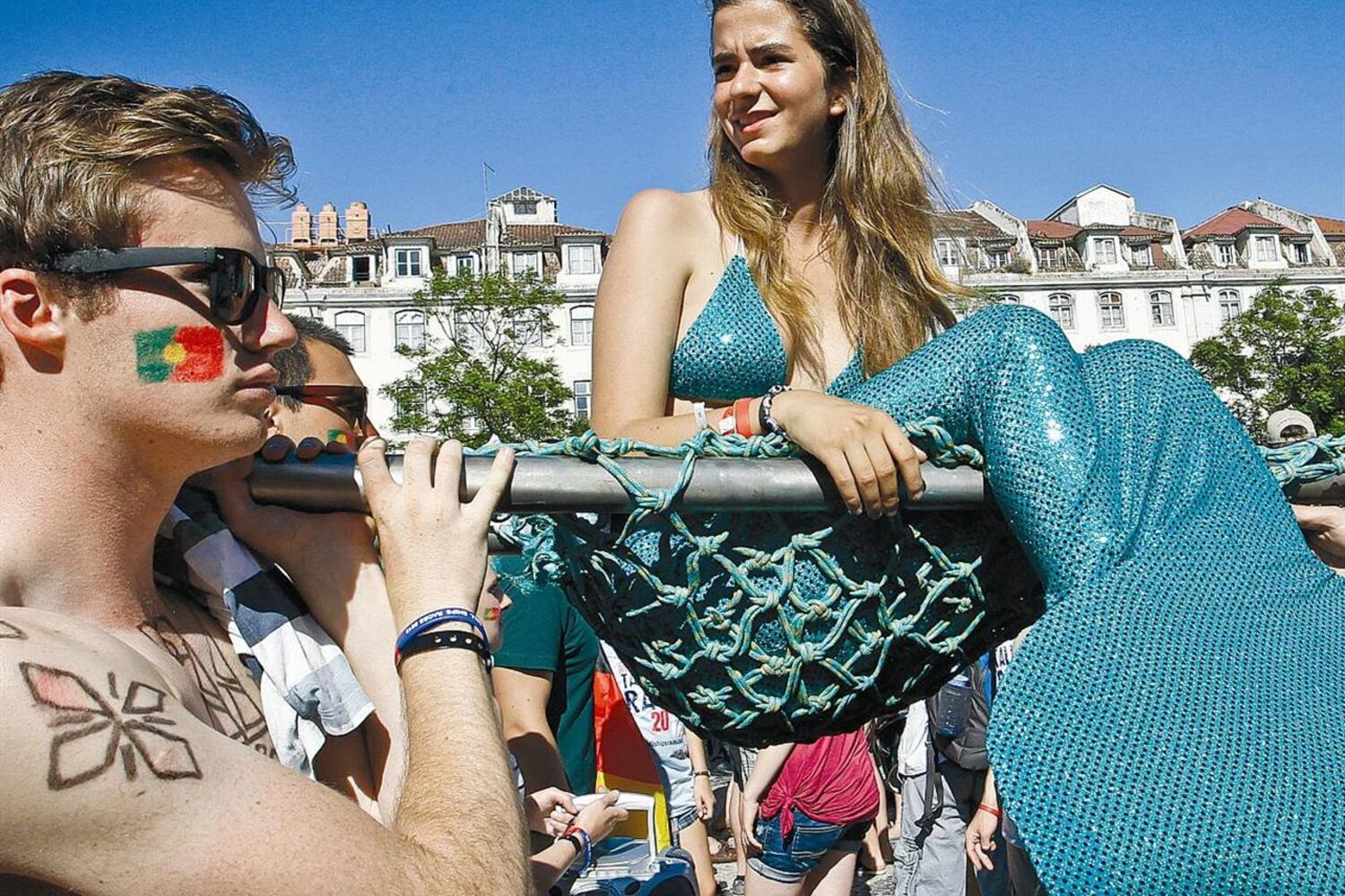 A rua Augusta, em Lisboa, encheu para ver passar o desfile das tripulações dos grandes veleiros acostados em Santa Apolónia. A guarnição do Navio-Escola Sagres abriu a parada, com os militares a transportar a bandeira portuguesa. À passagem do símbolo nacional, os populares aplaudiam e gritavam "Viva Portugal". Minutos antes do início do desfile, o tenente Nunes dos Santos classificou de "elevado o espírito dos militares perante o orgulho de representar Portugal na cerimónia".<br/><br/>