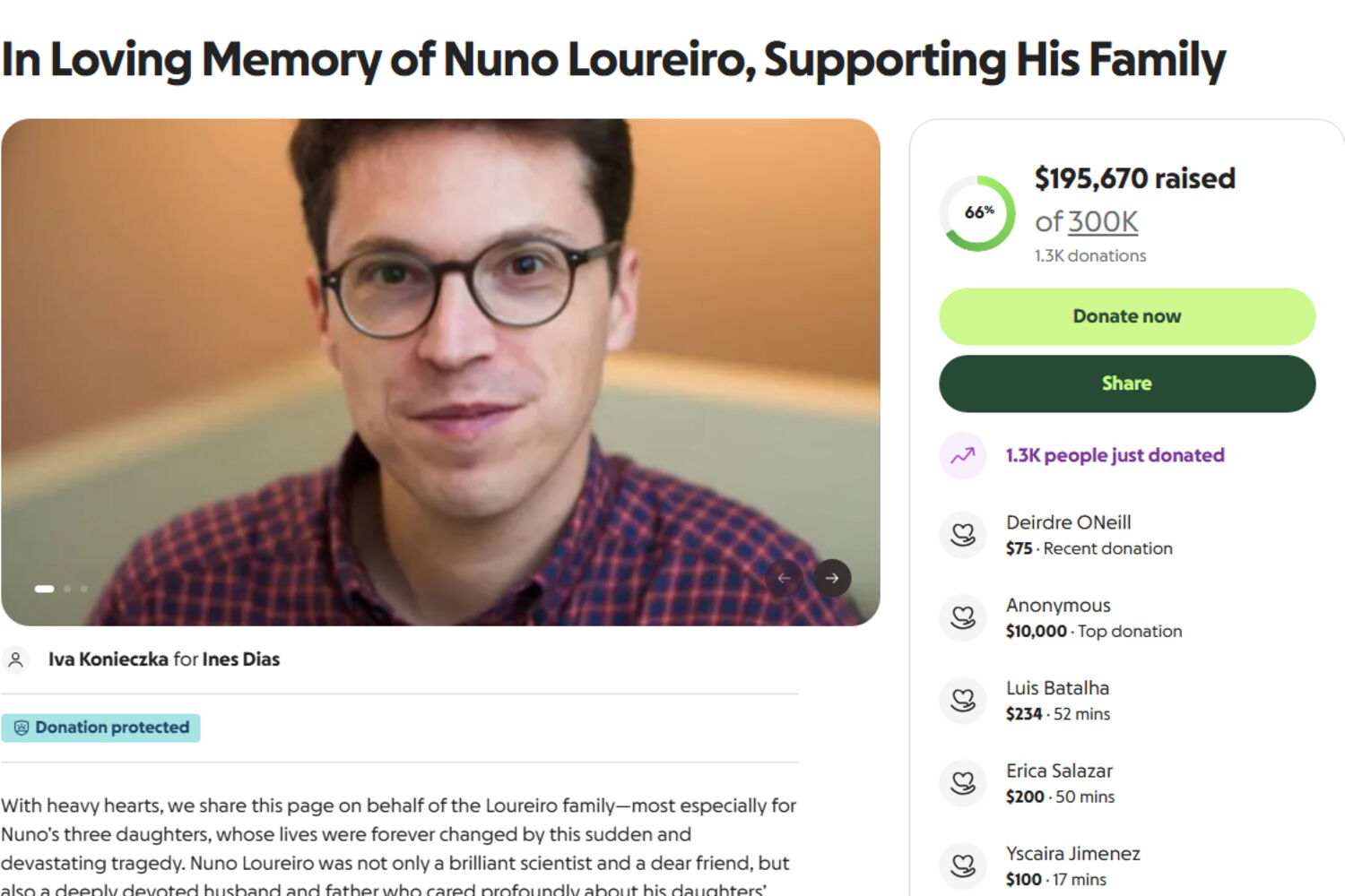 “É com grande consternação que partilhamos esta página em nome da família do Nuno Loureiro — especialmente pelas suas três filhas, cujas vidas mudaram para sempre com esta tragédia súbita e devastadora”, revela o peditório criado no ‘Gofundme’.