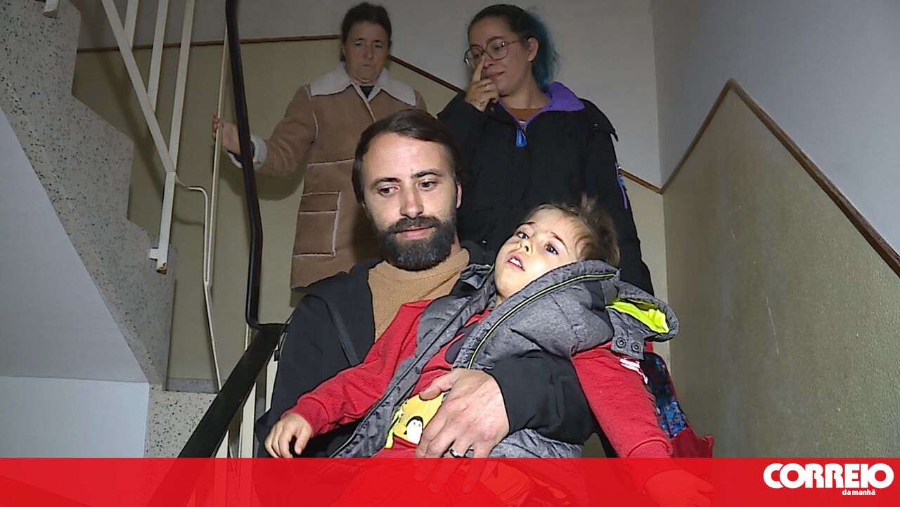Família tem de subir 67 degraus todos os dias com filho de 6 anos, que tem 95% de incapacidade, ao colo.