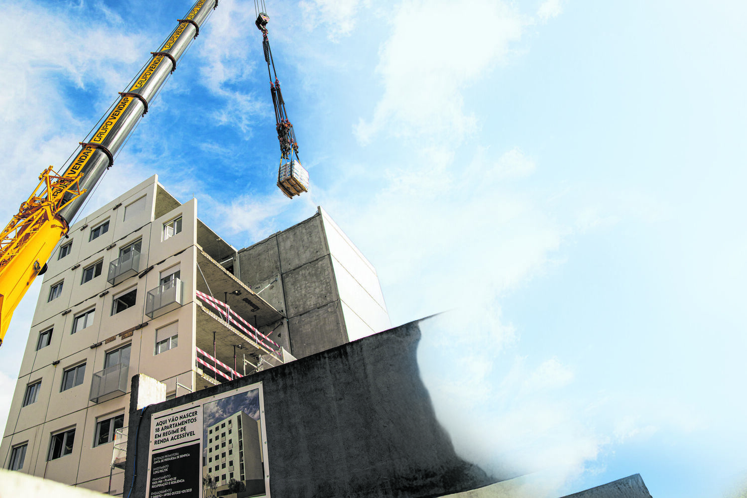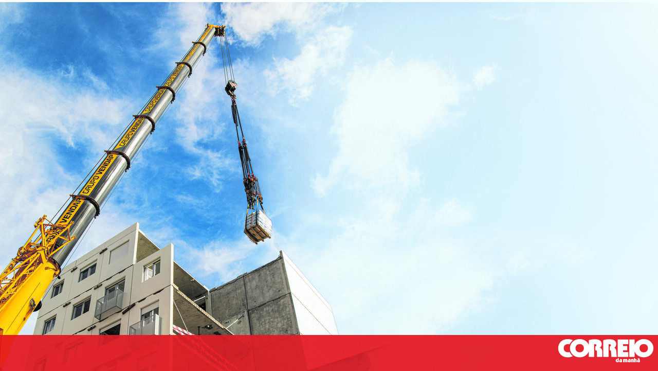 Os blocos de betão são descarregados do camião e facilmente erguidos pela grua estrategicamente colocada ao lado do edifício. Parecem peças de um lego de grandes dimensões que se vão encaixando umas nas outras e que, como as de brincar, incluem chão, paredes e até janelas com estores. Até os estendais já estão fixados no exterior do edifício.