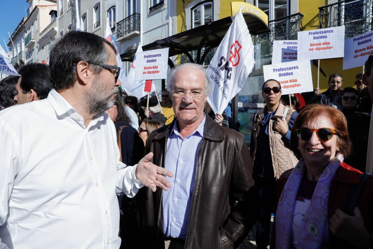 Rodeado de professores que exibiam cartazes onde se lia "Exigimos respeito", "Não ao Apagão" ou "Horários precários, Não", Mário Nogueira garantiu que a luta dos professores tem muita força e que se parassem agora e não retomassem a luta em setembro, tudo voltaria atrás, algo que não vai acontecer.
