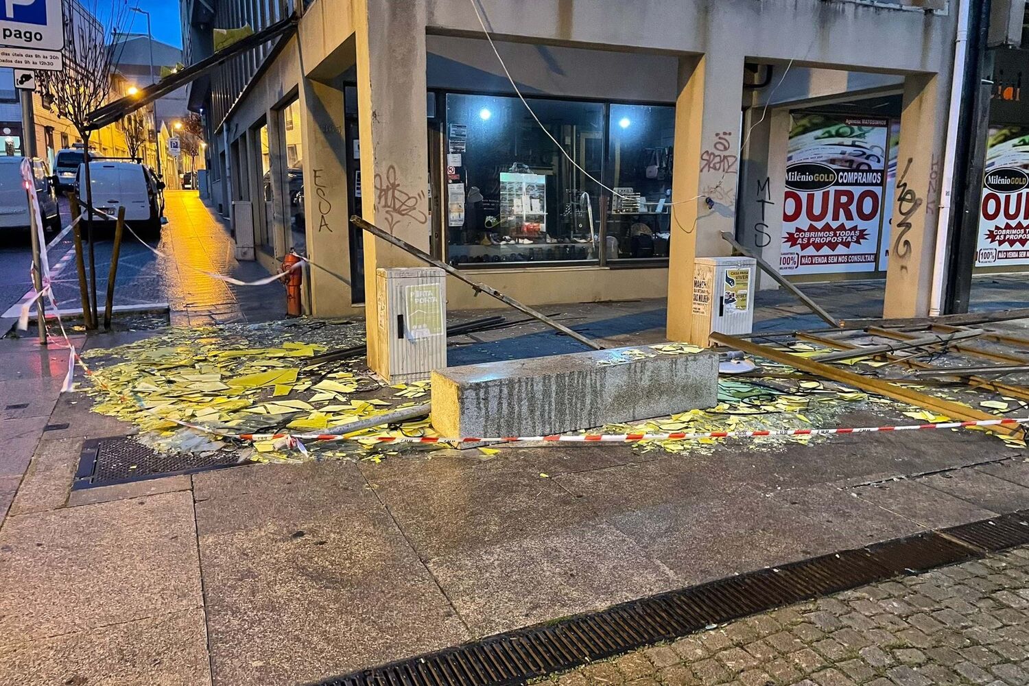 O alerta foi dado às 02h08 para a queda de estruturas, na esquina da rua Brito Capelo com a rua Primeiro de Dezembro.