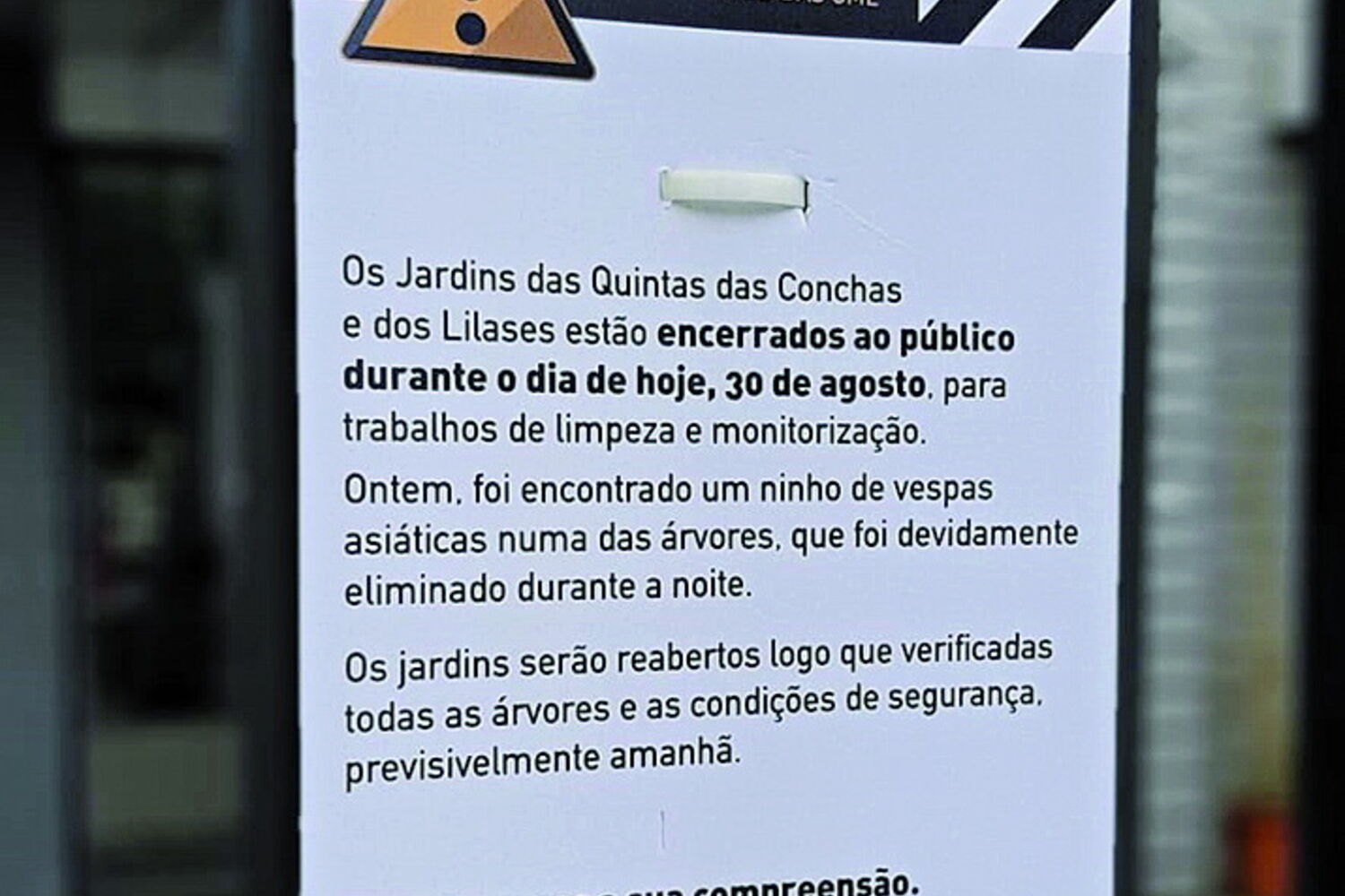 Os jardins das Quintas das Conchas e dos Lilases, na freguesia do Lumiar, em Lisboa, encerraram esta sexta-feira ao público, depois de sido descoberto um ninho de vespas-asiáticas na quinta-feira. Segundo a Câmara de Lisboa, o ninho já foi destruído mas ainda não se sabe quando vão reabrir os jardins.