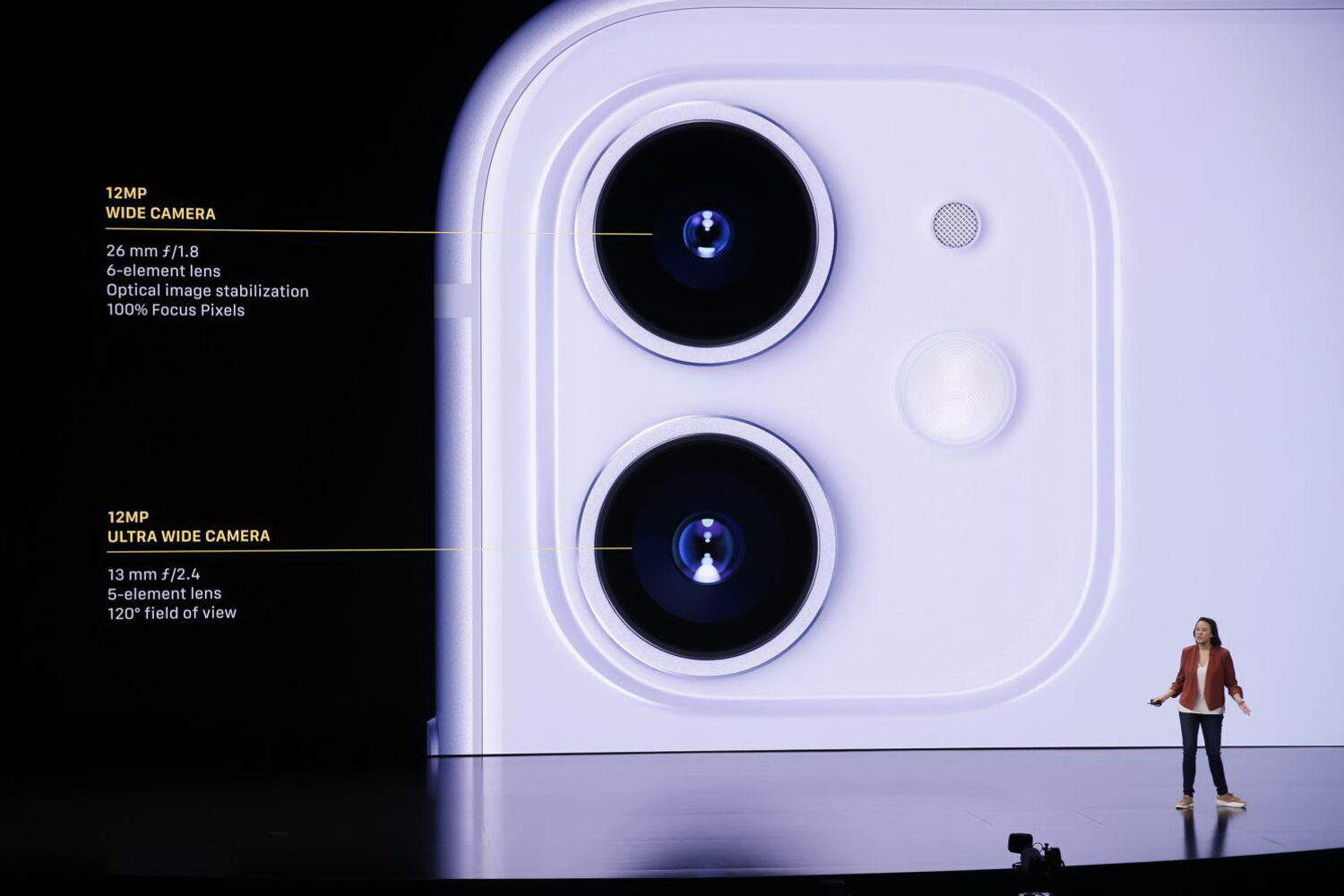 O iPhone 11 possui um ecrã retina de 6,1 polegadas, áudio 3D (espacial) para criar um campo sonoro imersivo em torno do utilizador, e novas câmaras. Há uma nova câmara ampla para um foco automático mais rápido e uma câmara ultra-ampla (uma abertura angular maior) para captar mais elementos nas fotos.