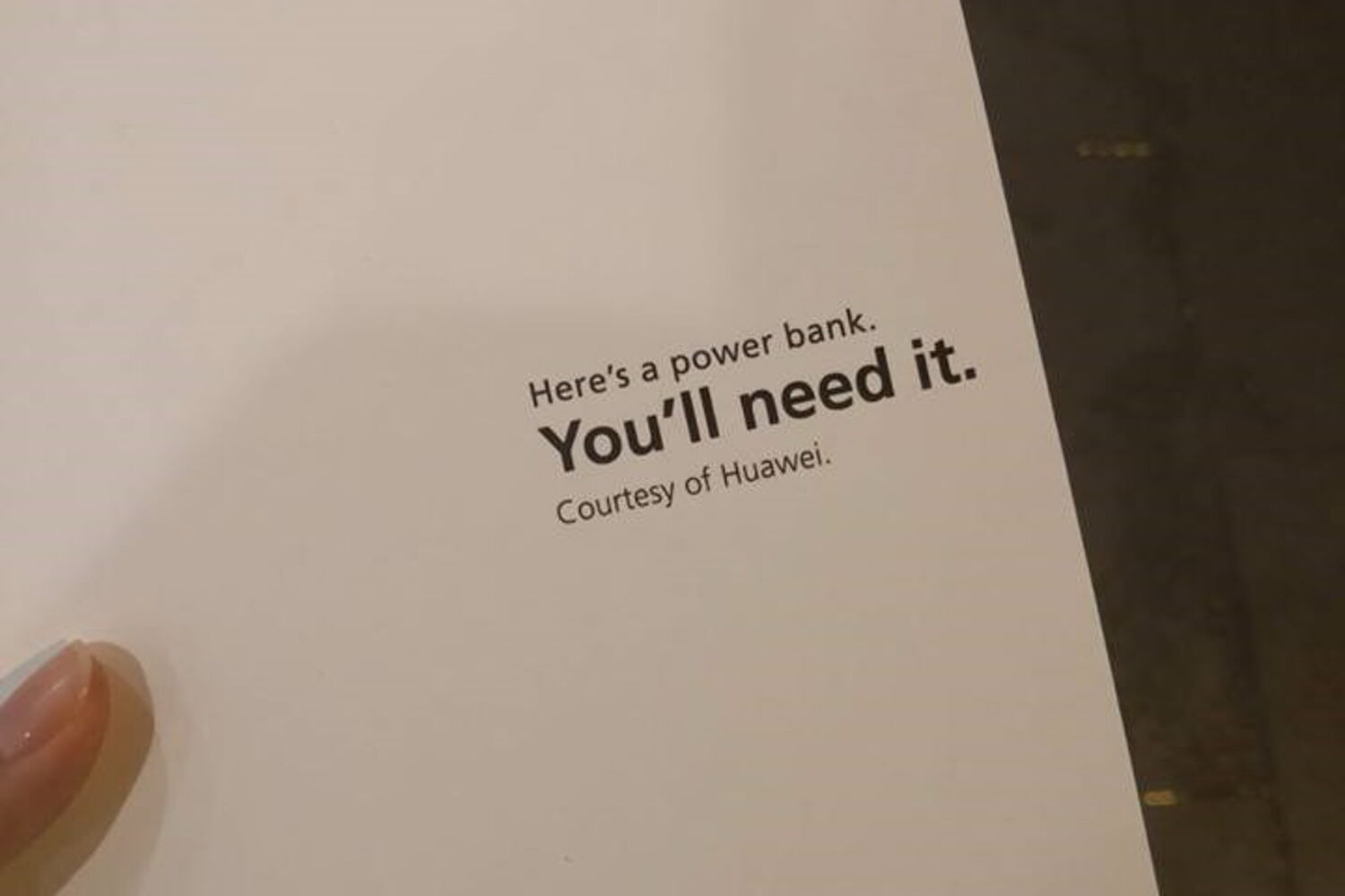 As baterias eram entregues numa caixa branca onde podia ler-se: " Aqui está uma powerbank. Vais precisar disto. Cortesia da Huawei".