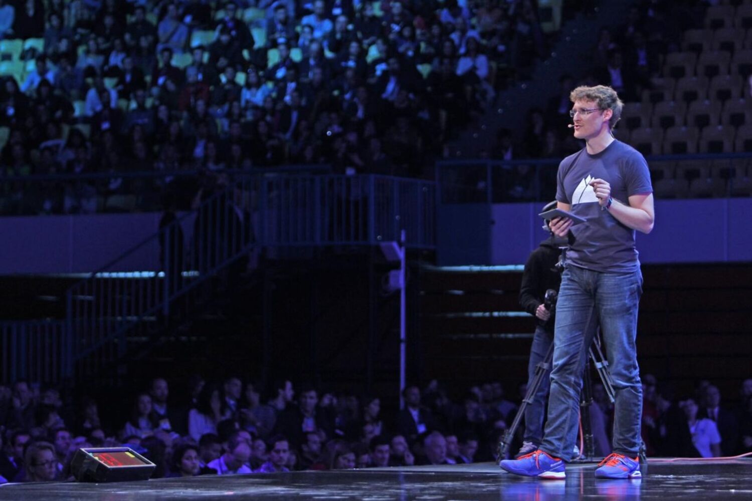 Cosgrave tentou exemplificar um tutorial sobre o 'live streaming' na rede social Facebook, mas o seu telemóvel não respondeu à velocidade exigida num evento de tecnologia, como provou a imagem do equipamento projetada em dois ecrãs gigantes do palco central.