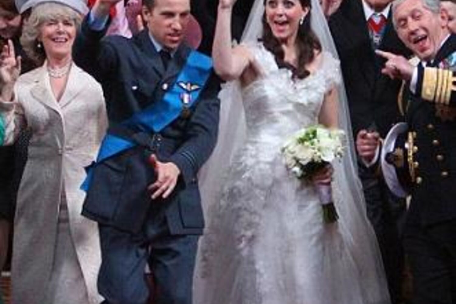 Mais discreta é a sósia da rainha Isabel II, que se limita a bater palmas e a fazer o tradicional aceno para os convidados, enquanto os actores que interpretam os dois noivos transformam a abadia uma verdadeira pista de dança.
