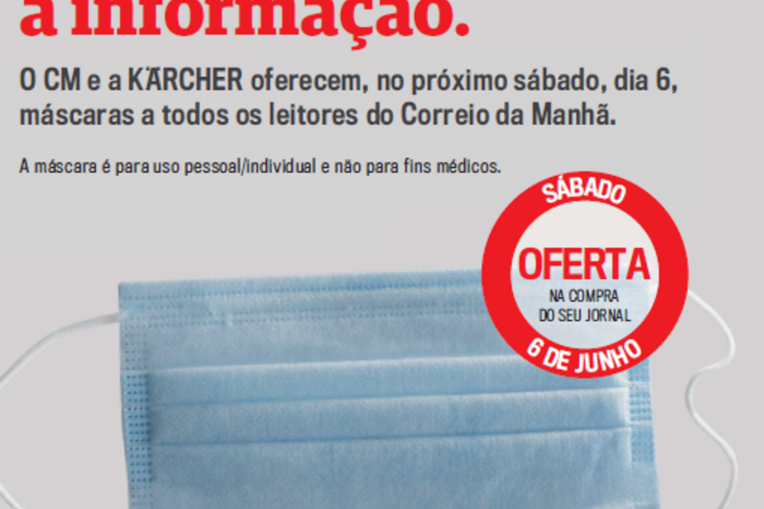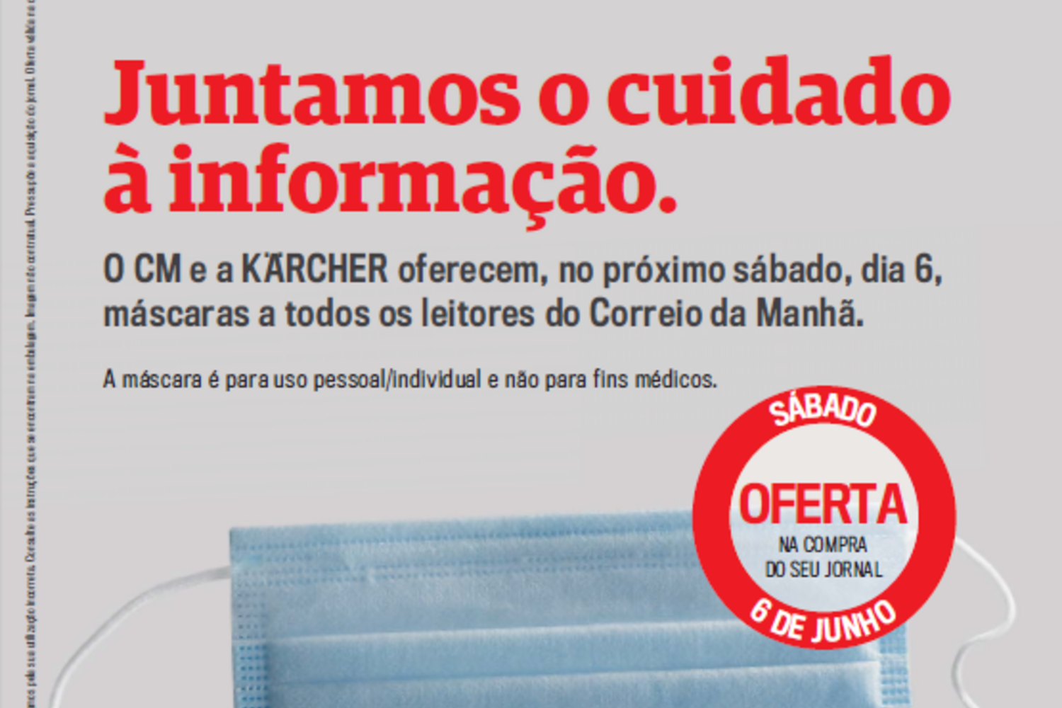 Uma iniciativa que se repete - é a segunda vez que o seu jornal diário lhe oferece uma máscara -, desta vez em parceria com a Karcher. A máscara, que oferecemos na compra do jornal, encontra-se devidamente acondicionada no interior de um plástico que envolve a revista Vidas, que acompanha a edição do CM nesse dia.