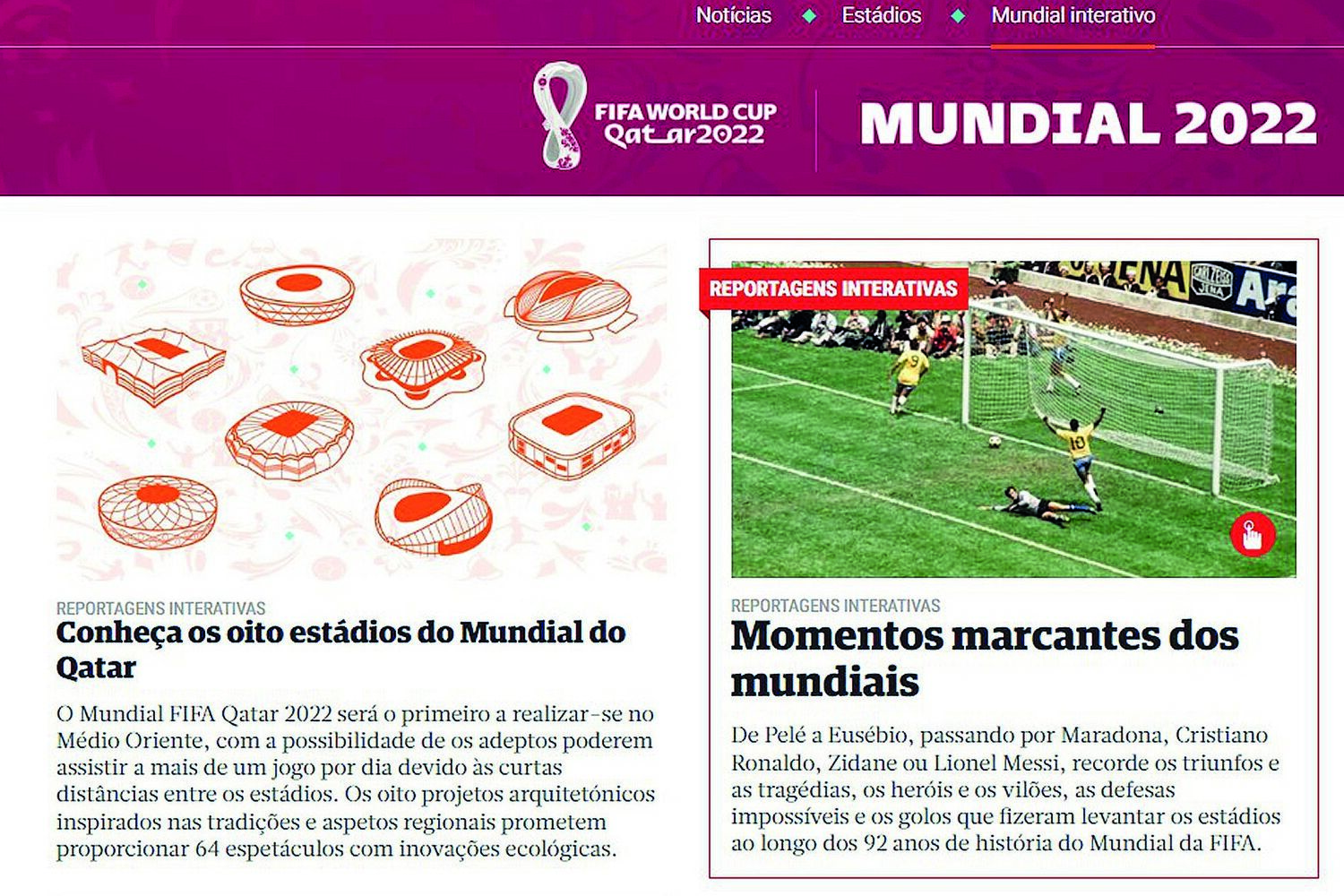 As características, localização e imagens dos estádios do Qatar 2022, os momentos mais marcantes da história dos mundiais ou o funcionamento da nova tecnologia semiautomática, o fora de jogo, merecerão tratamento interativo no canal que será enriquecido até ao apito inicial no estádio Al Bayt.