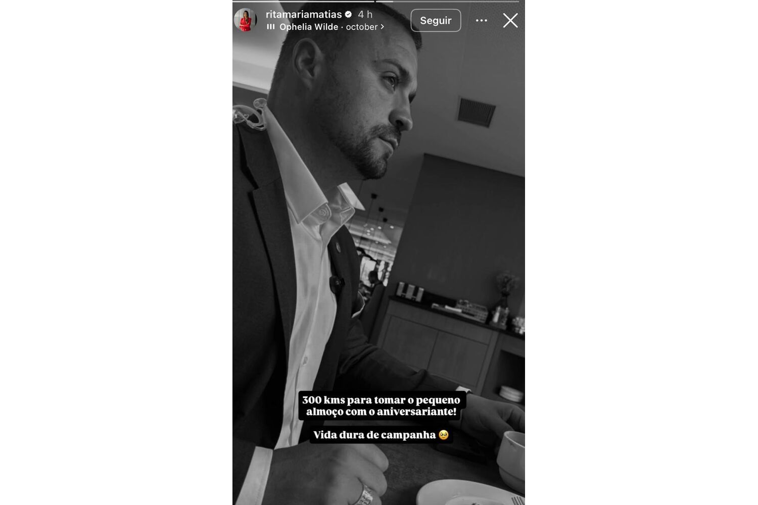 "300 km para tomar o pequeno-almoço com o aniversariante. Vida dura de campanha", escreveu Rita Matias nos stories do Instagram, acompanhando a frase com uma fotografia do companheiro.