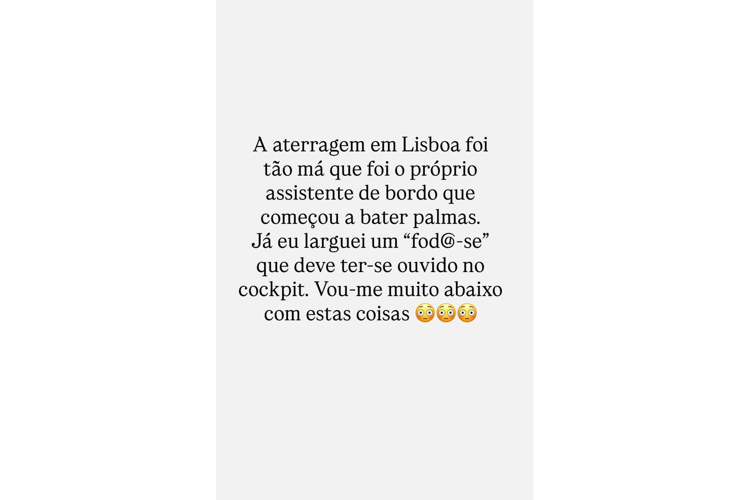 "A aterragem em Lisboa foi tão má que foi o próprio assistente de bordo que começou a bater palmas", começou por contar. Ainda assim, confessou que não conseguiu manter a calma: "Já eu larguei um ‘fod@-se’ que deve ter-se ouvido no cockpit. Vou-me muito abaixo com estas coisas".