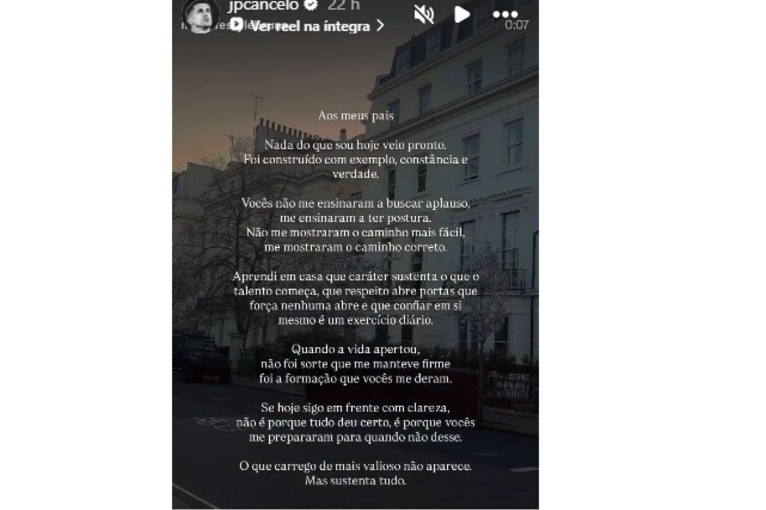 "Aos meus pais, nada do que sou hoje veio pronto. Foi construído com exemplo, constância e verdade. Vocês não me ensinaram a buscar aplauso, me ensinaram a ter postura. Não me mostraram o caminho fácil, me mostraram o caminho correto", disse o jogador nas stories, aproveitando um texto viral nas redes sociais, cujo autor não é conhecido.