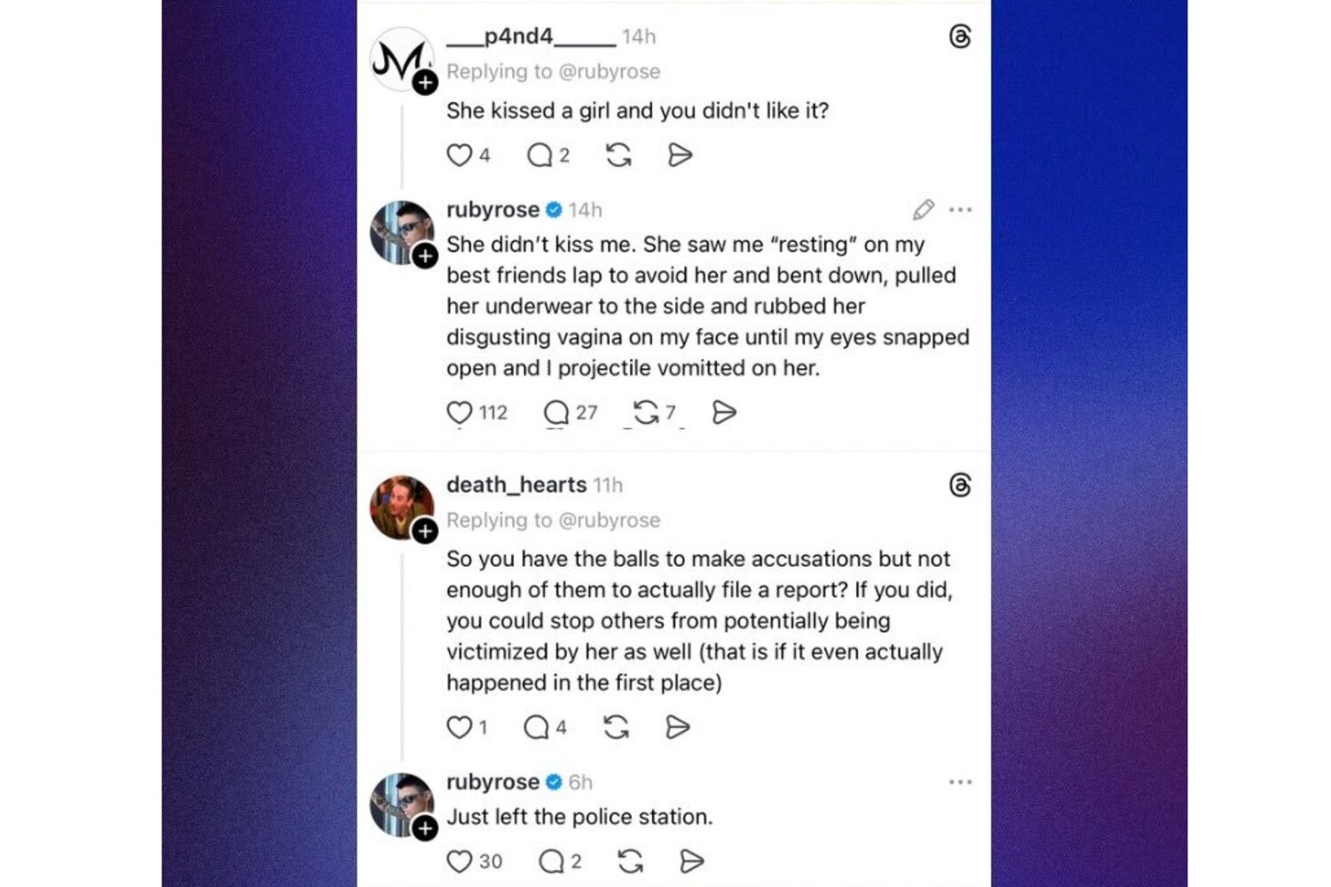 Quando um utilizador respondeu a dizer "ela beijou uma rapariga e tu não gostaste?", fazendo referência à famosa canção de Katy Perry, Ruby respondeu: "Ela não me beijou. Ela viu-me a descansar no colo da minha melhor amiga para a evitar, abaixou-se, puxou as cuecas para o lado e esfregou a sua vagina nojenta na minha cara até eu abrir os olhos de repente e vomitar sobre ela", disse, acrescentando: "Ela é mais do que bem-vinda a processar-me (ela não o fará, porque aconteceu, tenho fotos e foi literalmente em público e testemunhado por várias pessoas)".