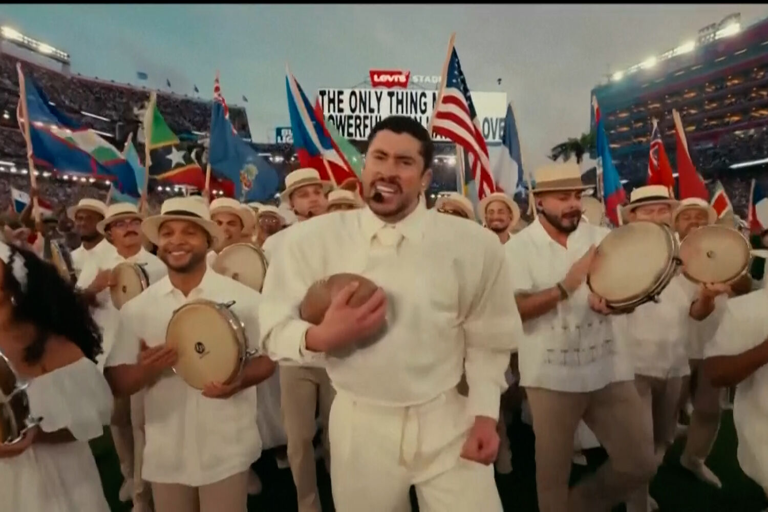 O seu poder é tanto que se deu ao luxo de atuar no Super Bowl em castelhano. A tacada a Trump não podia faltar. Exibiu uma mensagem onde se lia: “A única coisa mais poderosa do que o ódio é o amor. Juntos, somos a América.”