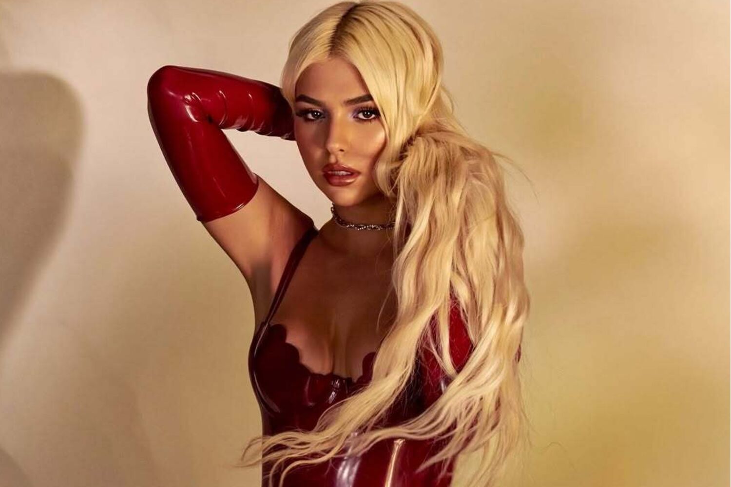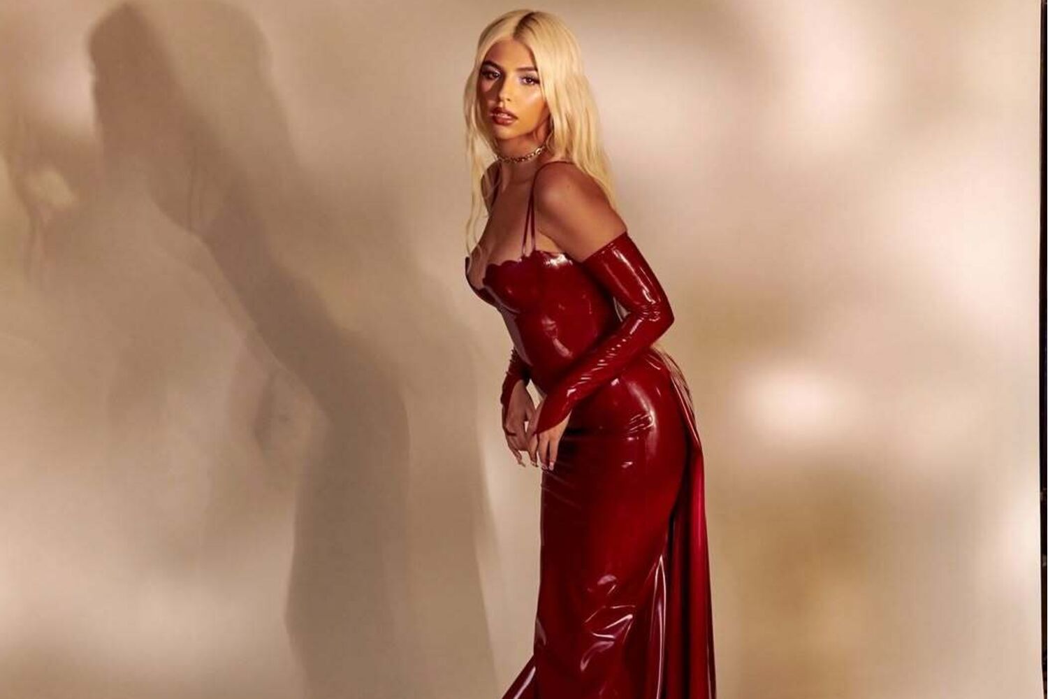A cantora, de 23 anos, fez uma produção fotográfica num ousado modelo em vinil com decote.