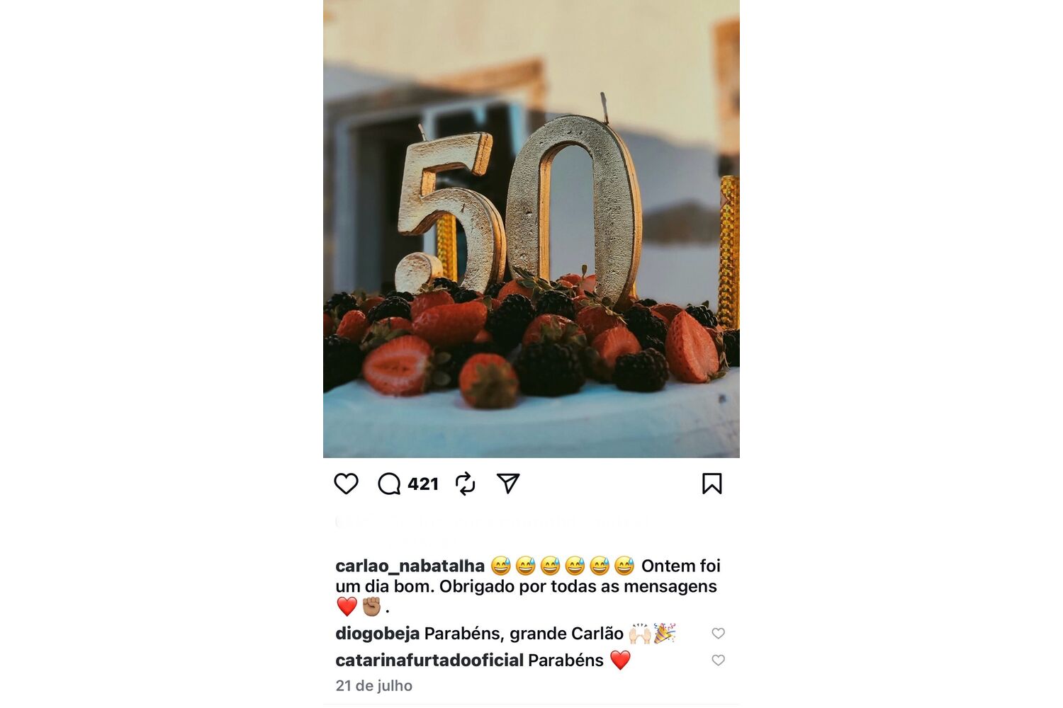 O músico felicitou a apresentadora pelo seu 53.º aniversário na segunda-feira, escrevendo "Parabéns", seguido de cinco corações. Também quando Carlão fez 50 anos, a 20 de julho , a apresentadora comentou o perfil, dizendo "Parabéns" e colocando um símbolo de coração.