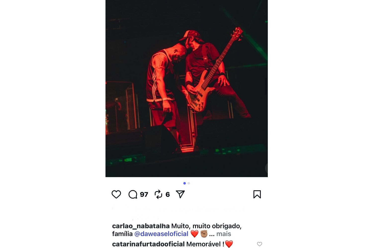 Após ter atuado no festival Sol da Caparica com os Da Weasel e publicado fotos do concerto, a estrela da RTP comentou "Memorável" também com um coração.