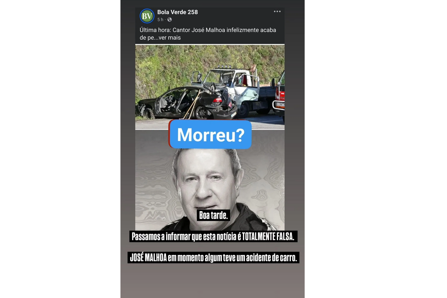 Perante a gravidade do boato, a equipa do artista recorreu à conta oficial no Instagram para desmentir categoricamente a informação. "Boa tarde. Passamos a informar que esta notícia é totalmente falsa", assegurando ainda que José Malhoa "em momento algum teve um acidente de carro".