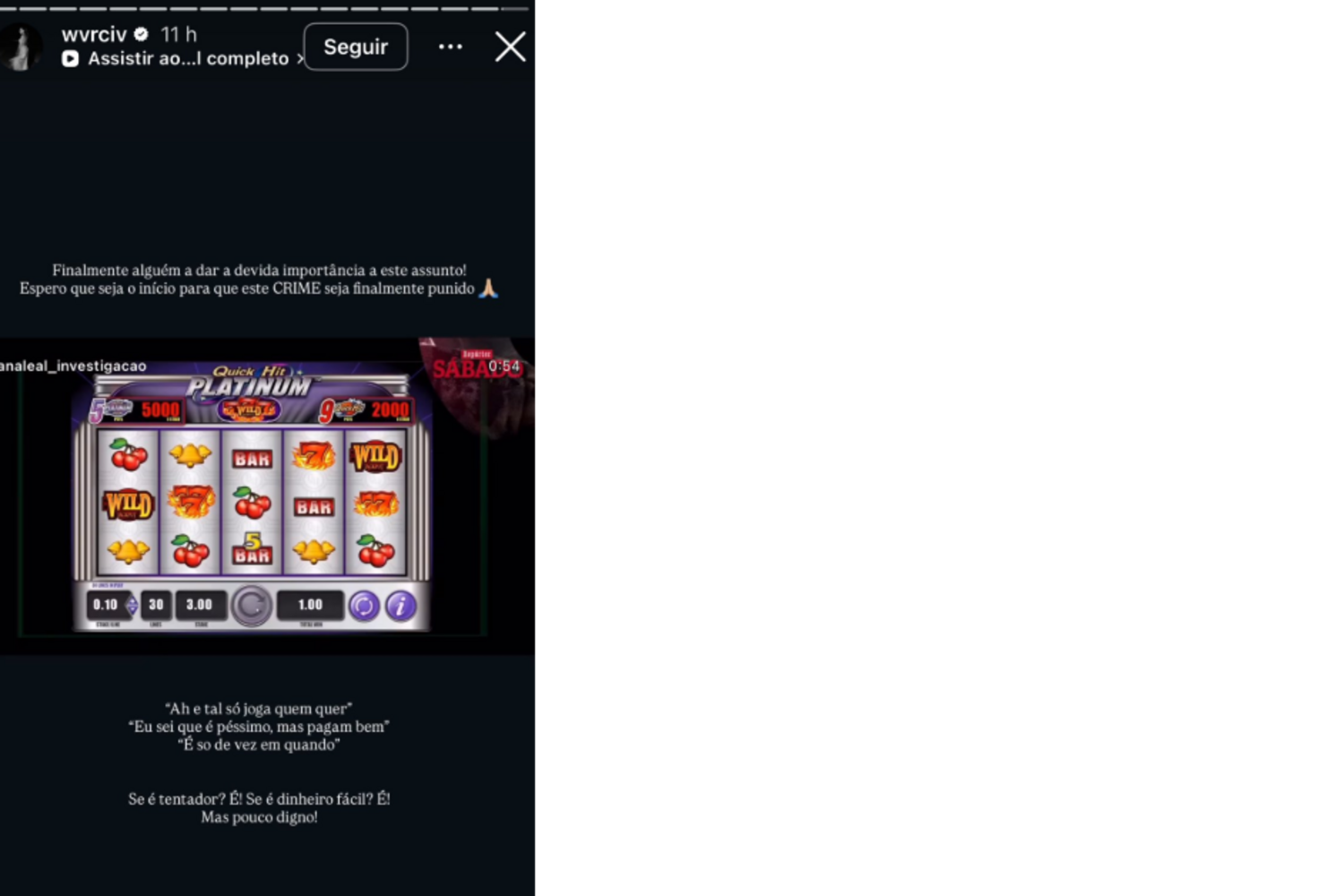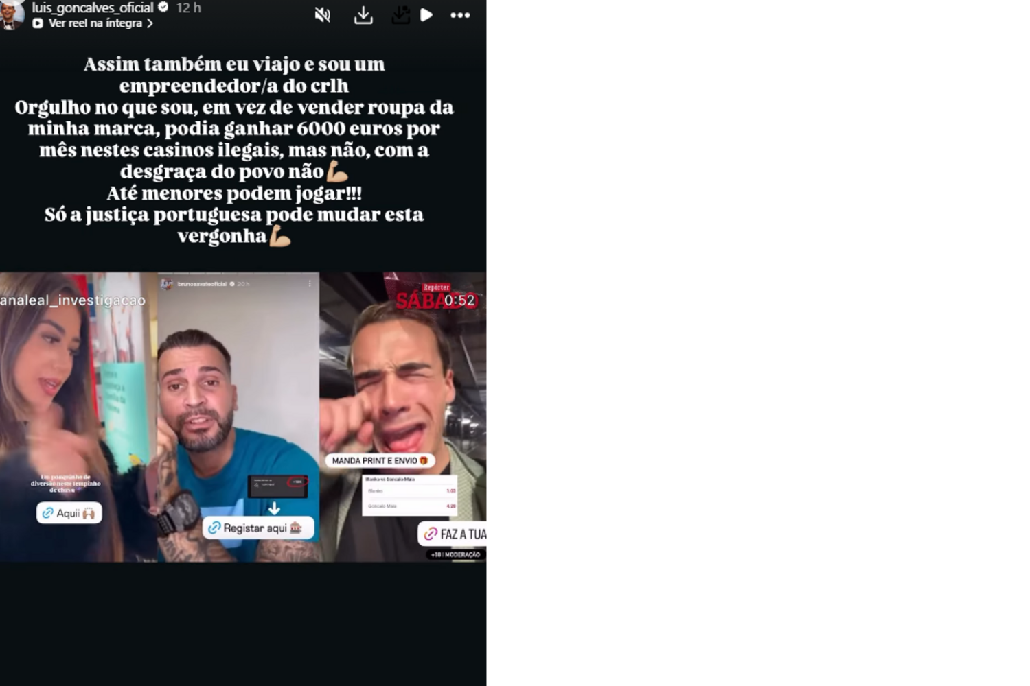 Luís Gonçalves, vencedor do 'Big Brother 2025' (TVI), partilhou excertos da reportagem e criticou duramente quem aceita este tipo de campanhas. "Assim também eu viajo e sou um empreendedor/a do c******. Orgulho no que sou, em vez de vender roupa da minha marca, podia ganhar 6000 euros por mês nestes casinos ilegais, mas não, com a desgraça do povo não. Até menores podem jogar!!!. Só a justiça portuguesa pode mudar esta vergonha", afirmou.