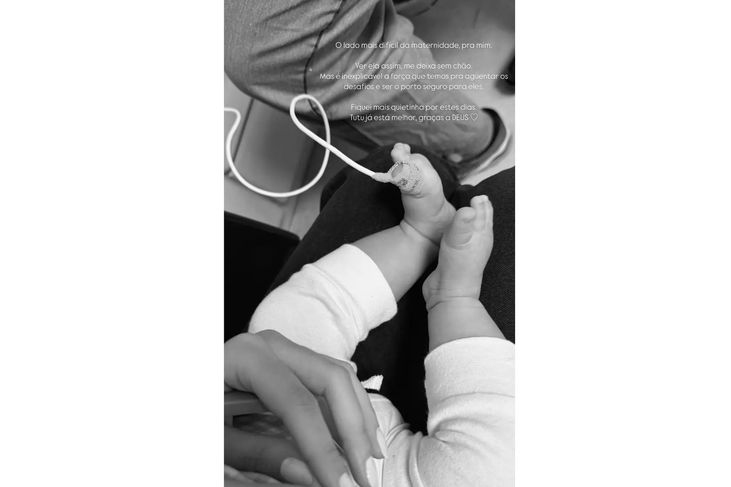 "O lado mais difícil da maternidade, para mim. Vê-la assim deixa-me sem chão. Mas é inexplicável a força que temos para aguentar os desafios e ser o porto seguro para eles", escreveu Amanda Kimberlly numa publicação feita nas redes sociais, na qual é possível ver a pequena com um oxímetro - dispositivo para a medição dos batimentos cardíacos e saturação de oxigénio - no dedo do pé.