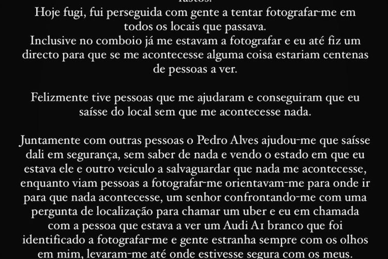"Juntamente com outras pessoas, o Pedro Alves ajudou-me a que saísse dali em segurança, sem saber de nada e vendo o estado em que eu estava, ele e outro veículo a salvaguardar que nada me acontecesse, enquanto viam pessoas a fotografar-me, orientavam-me para onde ir para que nada acontecesse. Um senhor confrontando-me com uma pergunta de localização para chamar um uber e eu em chamada com a pessoa que estava a ver um Audi Az branco que foi identificado a fotografar-me e gente estranha sempre com os olhos em mim, levaram-me até onde estivesse segura com os meus", escreveu no longo texto.