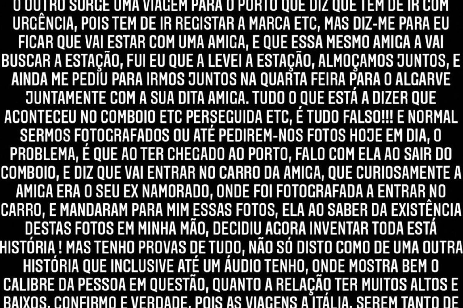 "Tudo o que está a dizer que aconteceu no comboio, etc, perseguida, etc, é tudo falso!!! É normal sermos fotografados ou até pedirem-nos fotos hoje em dia, o problema é que ao ter chegado ao Porto falo com ela ao sair do comboio e diz que vai entrar no carro da amiga, que curiosamente a amiga era o seu ex-namorado, onde foi fotografada a entrar no carro, e mandaram para mim essas fotos", atacou. Gonçalo Quinaz acusa Jessica de estar a mentir após ter sido apanhada na companhia do ex-namorado. "
