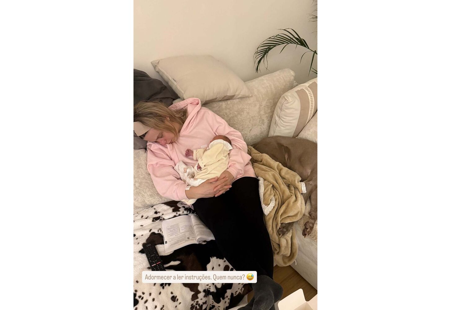 Noutras imagens, surgem frases como: "Adormecer a fazer scroll na Zara? Quem nunca!" e "Adormecer a ler instruções. Quem nunca?", retratando, com humor, o cansaço acumulado típico dos primeiros dias com um recém-nascido.