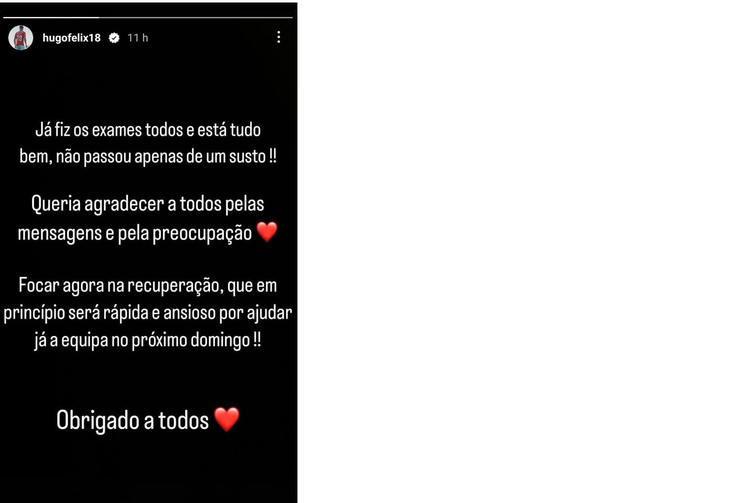 Agora, recorreu às redes sociais para notificar os fãs e seguidores que se encontra bem. "Já fiz os exames todos e está tudo bem, não passou apenas de um susto! Queria agradecer a todos pelas mensagens e pela preocupação. Focar agora na recuperação que, em princípio, será rápida e ansioso por ajudar já a equipa no próximo domingo! Obrigado a todos", escreveu no Instagram.