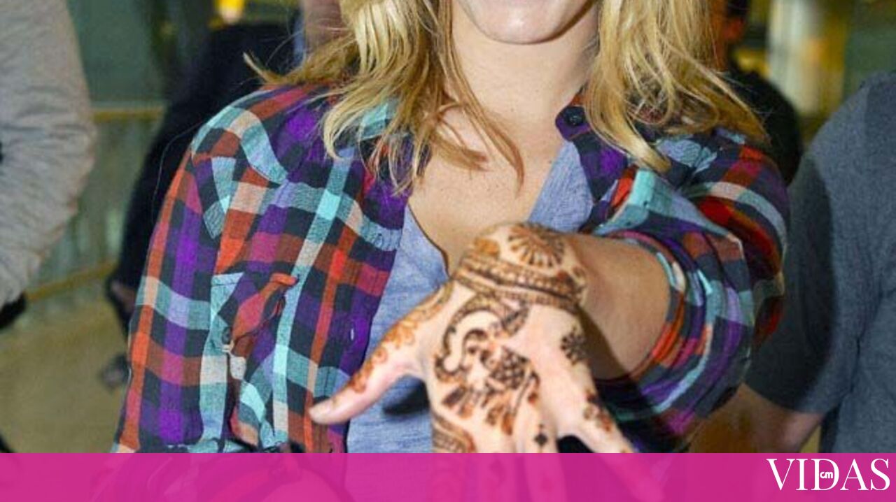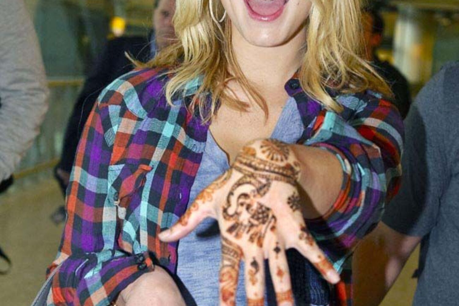 À chegada ao aeroporto Heathrow, em Londres, vinda de Mumbai, a actriz e cantora exibiu com orgulho um desenho temporário de henna na mão esquerda.