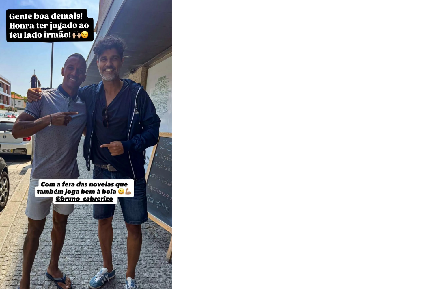 "Com a fera das novelas, que também joga bem à bola", escreveu Nani no Instagram, acompanhando o registo fotográfico. Bruno Cabrerizo retribuiu o carinho: "Gente boa demais. Uma honra ter jogado ao teu lado, irmão."