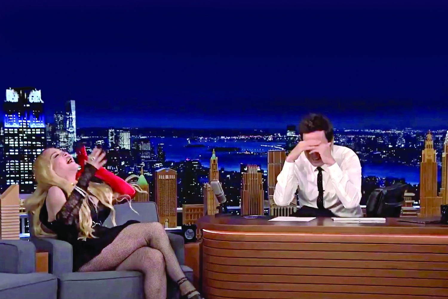 "Uma das frases que repito várias vezes é que os artistas estão aqui para perturbar a paz", disse Madonna a Jimmy Fallon, antes de se deitar na secretária do apresentador e de levantar as saias para mostrar o rabo à plateia.