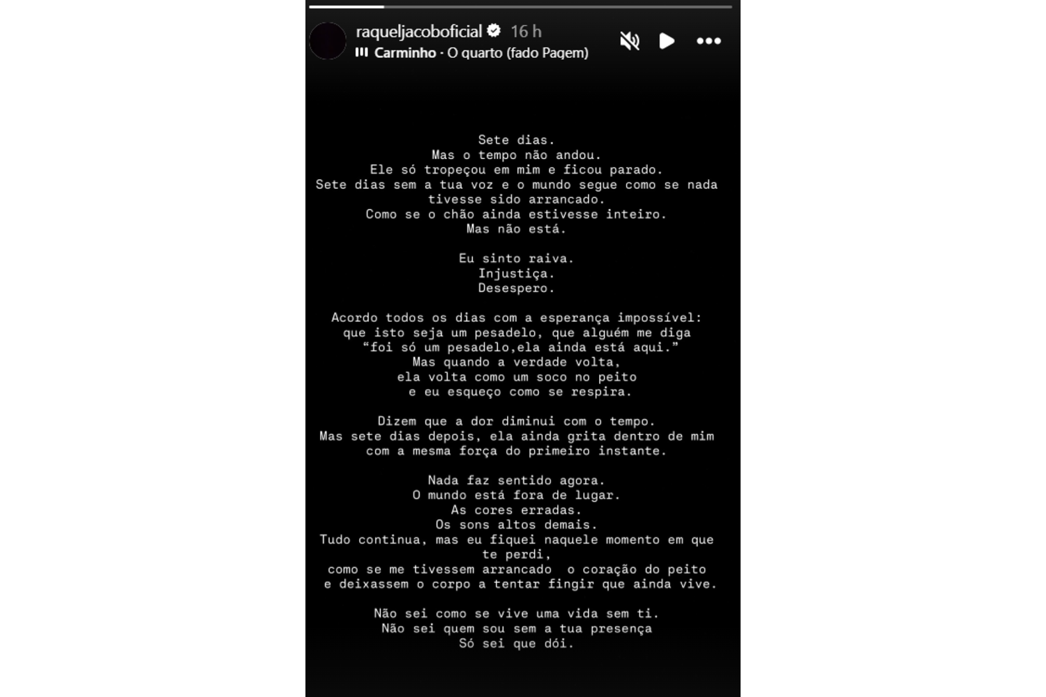 "Sete dias. Mas o tempo não andou. Ele só tropeçou em mim e ficou parado. Sete dias sem a tua voz e o mundo segue como se nada tivesse sido arrancado. Como se o chão ainda estivesse inteiro. Mas não está", começou por escrever, confessando sentimentos de "raiva, injustiça e desespero".