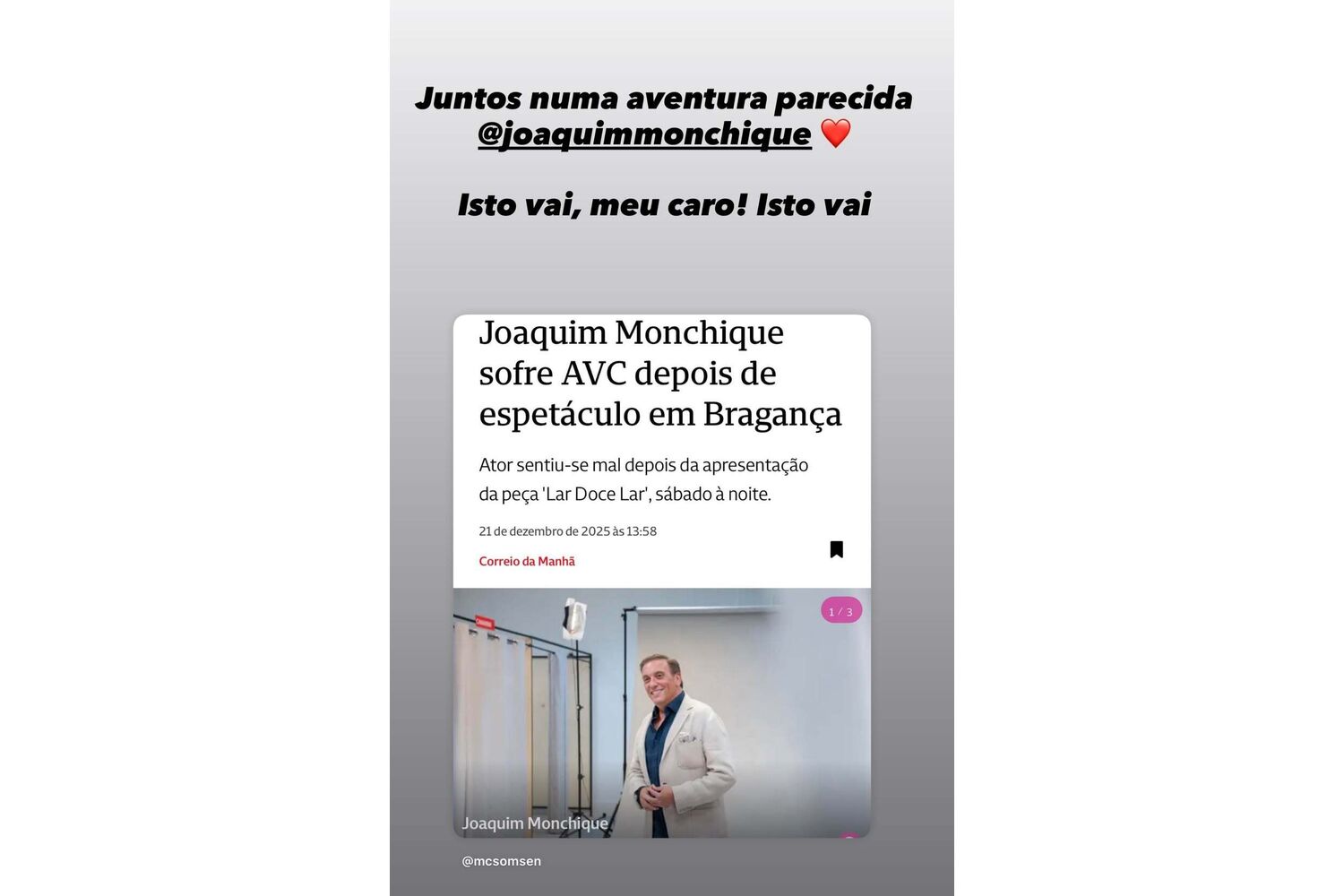 O radialista continua em recuperação após o AVC sofrido no passado dia 20 de novembro e recorreu às redes sociais, este domingo, 21 de Dezembro, para se dirigir ao ator. Nos stories do Instagram, Markl escreveu: "Juntos numa aventura parecida, Joaquim Monchique. Isto vai, meu caro. Isto vai."