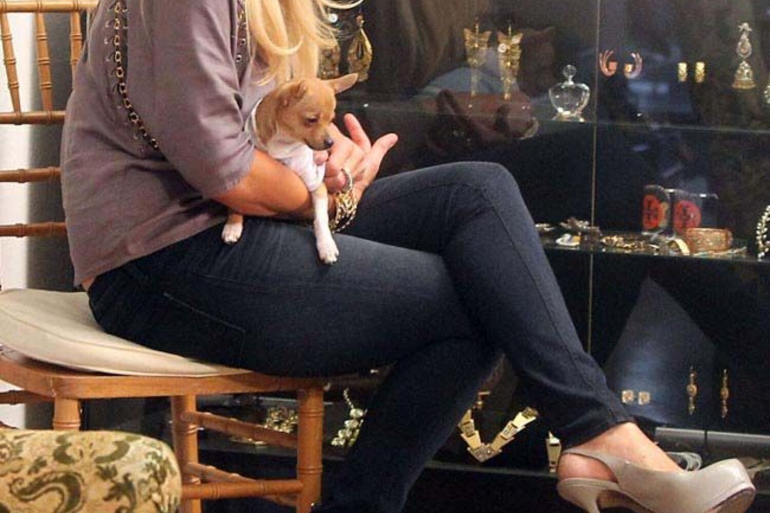 Exuberante, a socialite foi vista de chapéu largo e na companhia de um dos seus inseparáveis cães, da raça Chihuahua