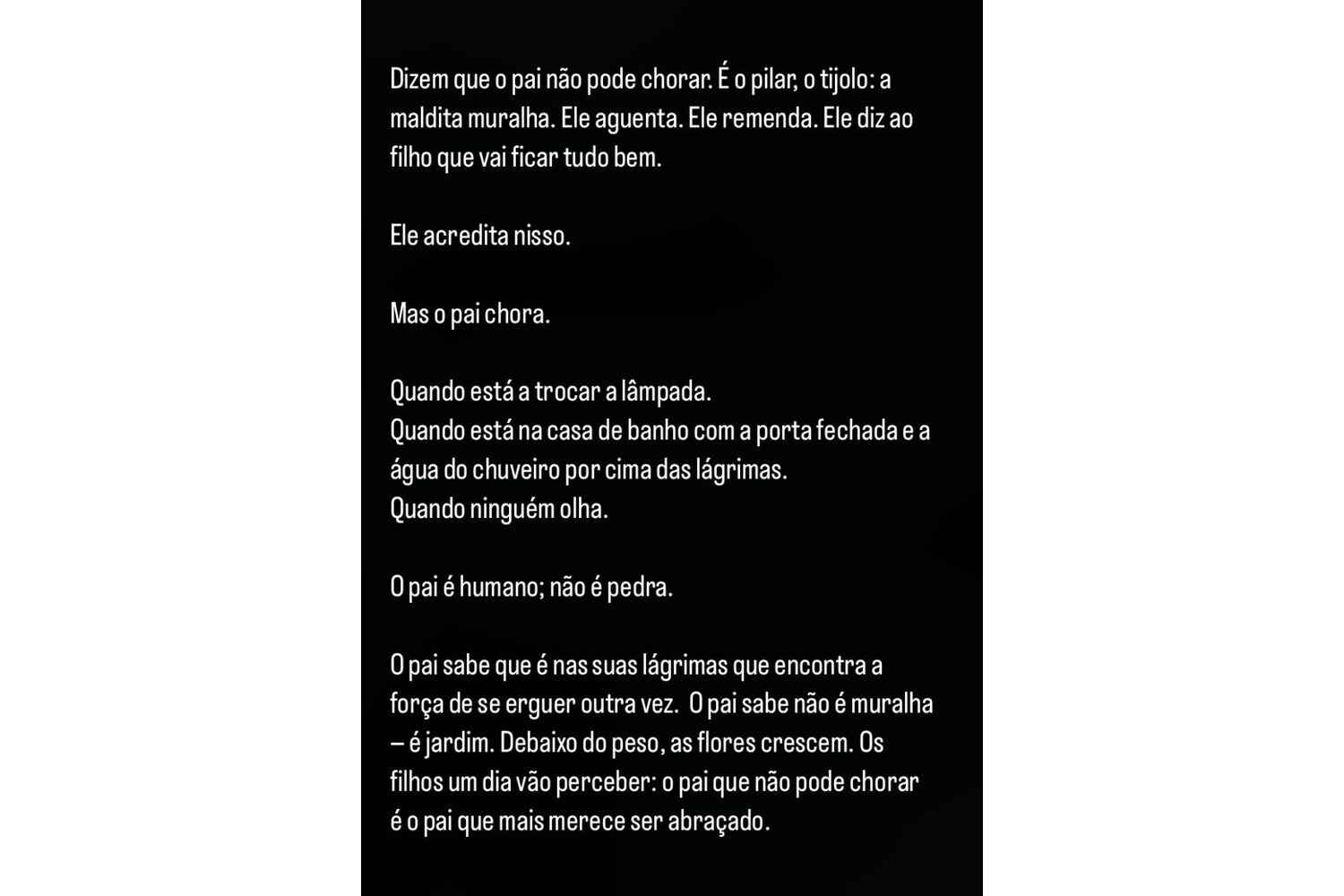 "Dizem que o pai não pode chorar. É o pilar, o tijolo: a maldita muralha. Ele aguenta. Ele remenda. Ele diz ao filho que vai ficar tudo bem. Ele acredita nisso", começou por escrever numa partilha feita através das 'stories' do Instagram.
