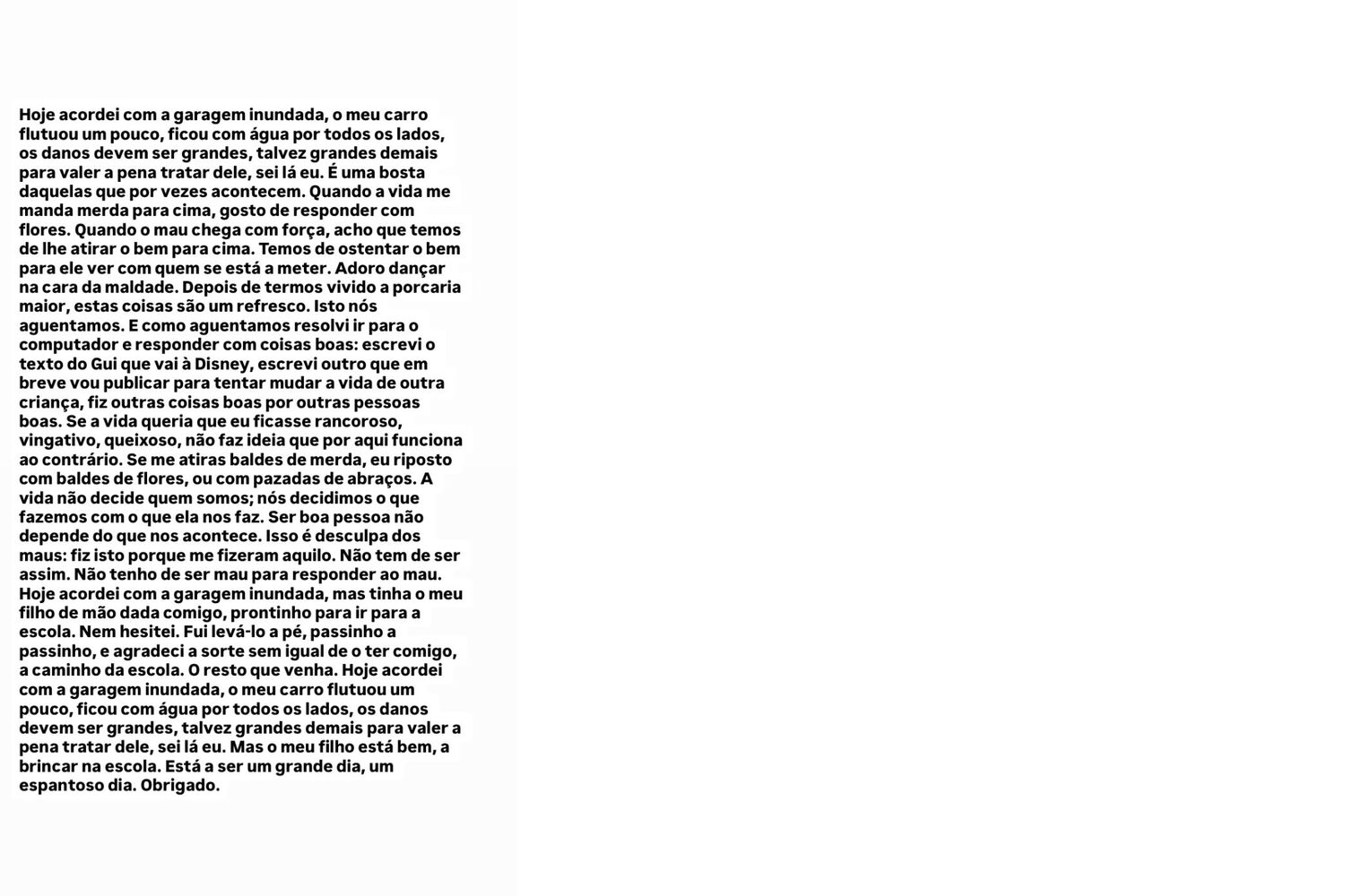 "Hoje acordei com a garagem inundada, o meu carro flutuou um pouco, ficou com água por todos os lados, os danos devem ser grandes, talvez grandes demais para valer a pena tratar dele, sei lá eu. É uma bosta daquelas que por vezes acontecem. Quando a vida me manda m** para cima, gosto de responder com flores. Quando o mau chega com força, acho que temos de lhe atirar o bem para cima. Temos de ostentar o bem para ele ver com quem se está a meter. Adoro dançar na cara da maldade", começou por revelar o escritor.